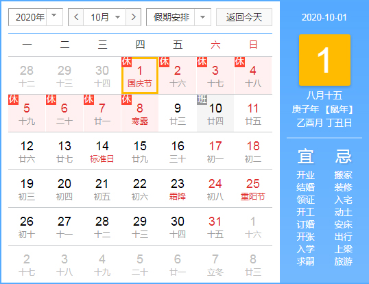 2020年國慶節(jié)、中秋節(jié)放假安排如下: